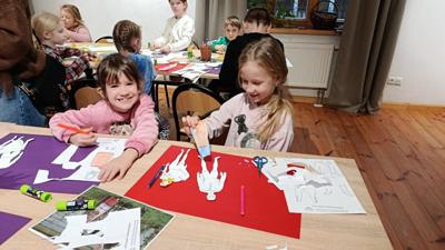 · Warsztatach edukacyjnych, których celem było przybliżenie lokalnego dziedzictwa kulturowego oraz tradycji regionu. Dzieci poznawały świąteczne obrzędy, codzienne zajęcia dawnych mieszkańców Podlasia, wykonywały tradycyjne ozdoby ludowe oraz zapoznawały się ze strojami ludowymi charakterystycznymi dla regionu, ich kolorystyką i zdobieniami.