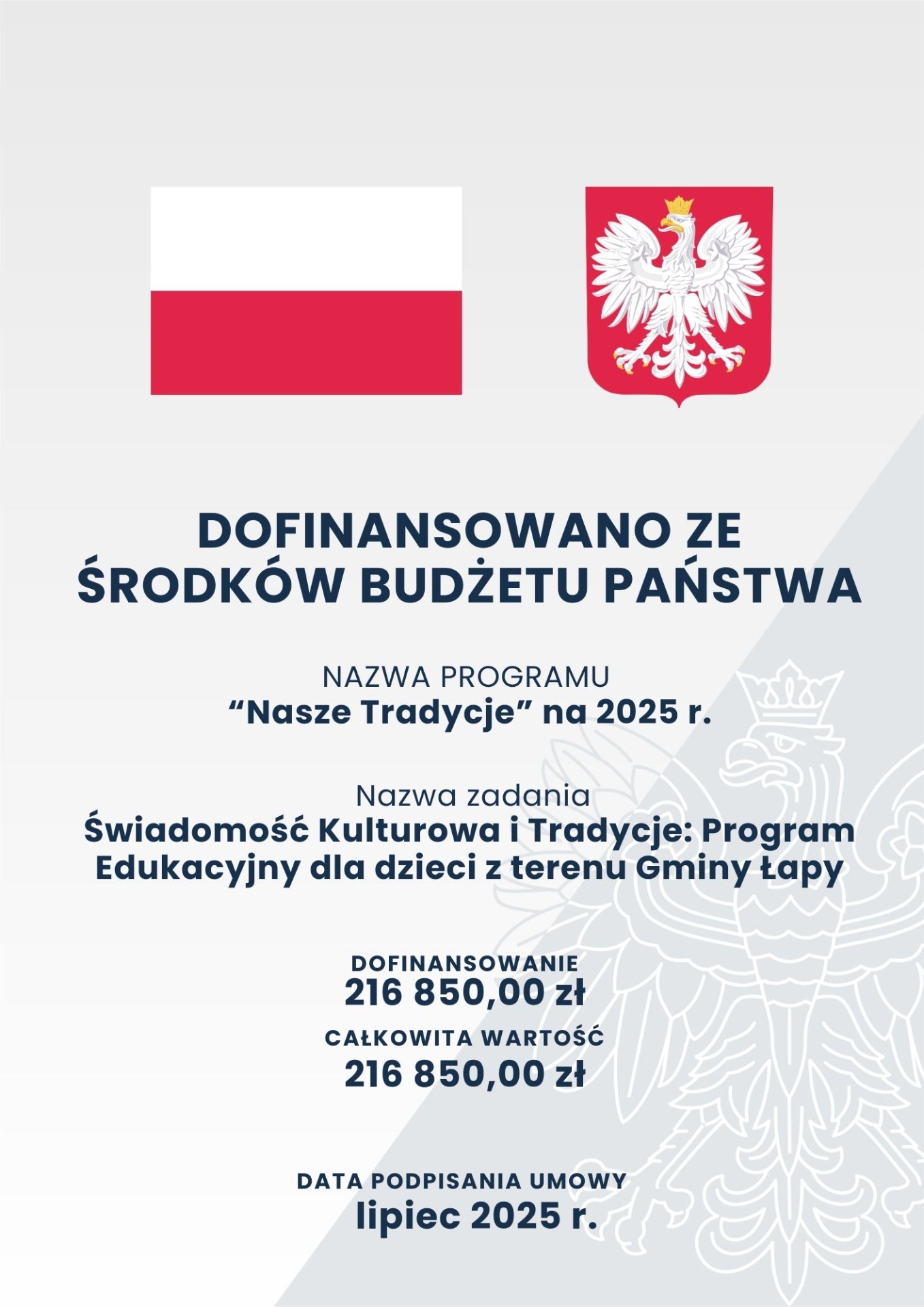 Projekt „Świadomość Kulturowa i Tradycje: Program Edukacyjny dla dzieci z terenu Gminy Łapy” został dofinansowany ze środków budżetu państwa, przyznanych przez Ministra Edukacji w ramach programu „Nasze Tradycje”, i stanowi przykład wartościowej inicjatywy wspierającej rozwój młodego pokolenia w duchu szacunku do lokalnej historii i tradycji.